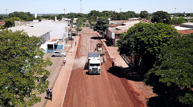 Obras de recape na Rua Brasil e demais vias da região central, com recursos estaduais, estão em andamento.
